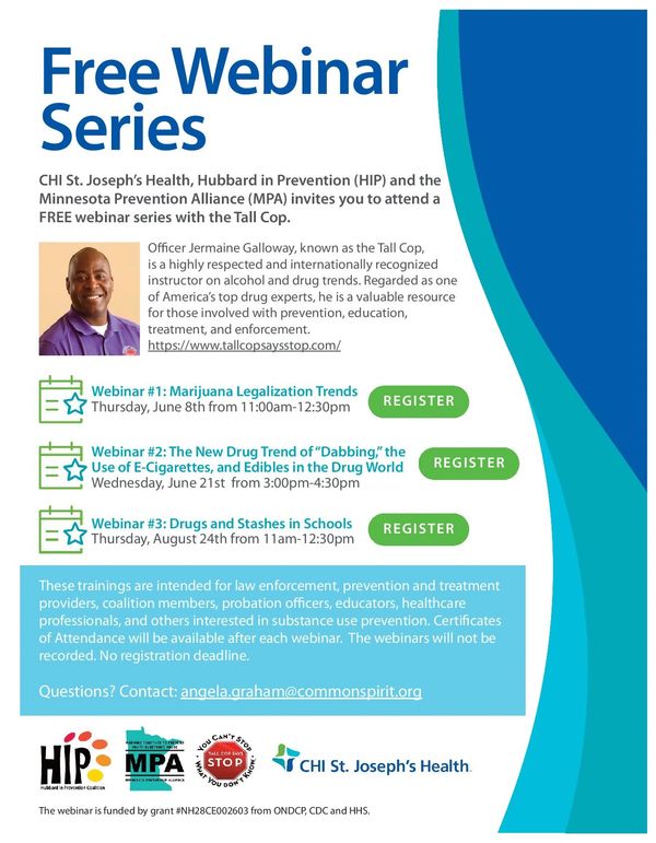 Hubbard in Prevention (HIP), CHI St. Joseph's Health and the Minnesota Prevention Alliance (MPA) is excited to host a three part webinar series featuring Officer Jermaine Galloway, "Tall Cop Says Stop". All three webinars are FREE and open to individuals 18 and older.